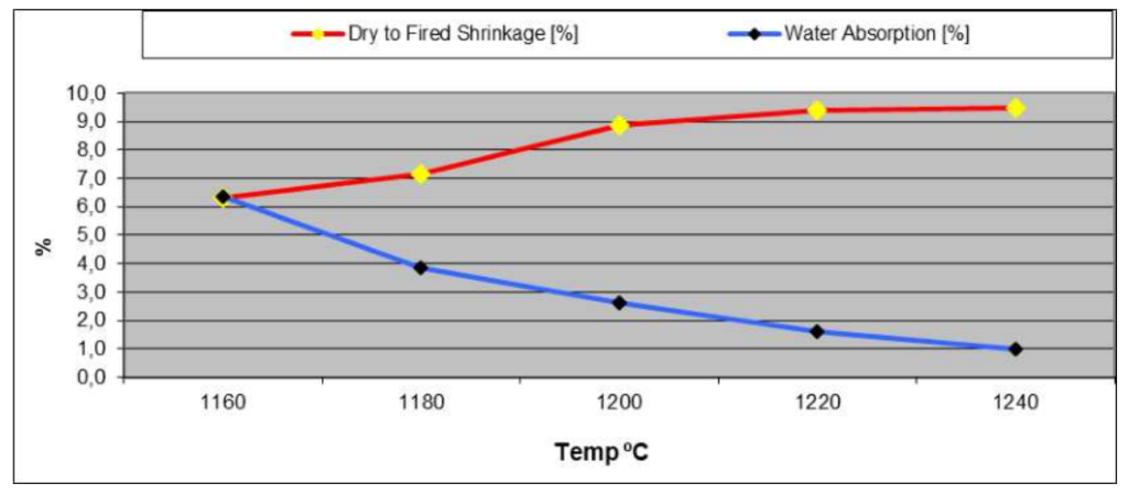 W glinie której głównie używam – Betongrau firmy Sibelco jest opisane 5,8% skurczu podczas suszenia i 9,5% podczas wypału na 1250 stopni, jak widać w tabelce poniżej.